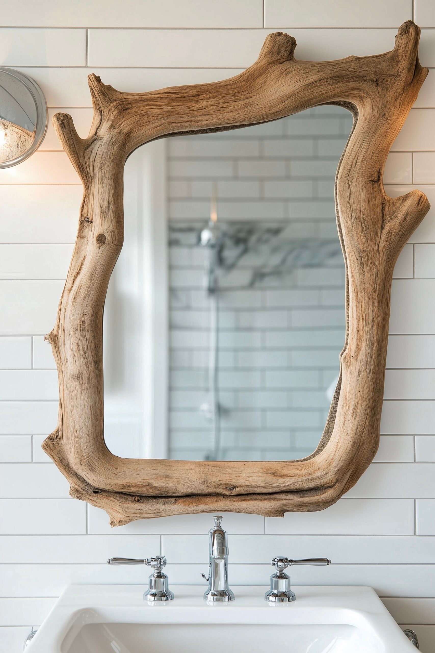Vous vous évanouissez en apercevant le prix des miroirs de salle de bains ? Alors j’ai une bonne idée pour vous. Attrapez un miroir ordinaire et agrémentez-le de bâtons de bois. Vous pourrez les coller au pistolet ou bien les clouez avec des pointes fines de couleurs sombres pour qu’elles se fassent le plus discrètes possibles.