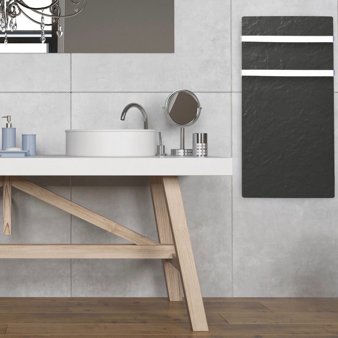 - Sèche-serviette électrique . Il peut être rayonnant (montée rapide de la chaleur), avec fluide caloporteur (le plus économique, diffuse une chaleur douce mais peut rouiller), à inertie sèche (cœur en céramique, stéatite ou pierre de lave qui emmagasine la chaleur puis la restitue progressivement, il est peu consommateur d’énergie ou soufflant (énergivore et bruyant).
