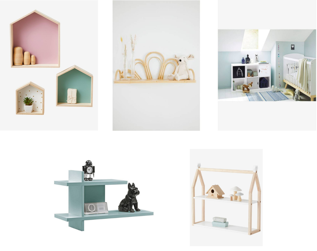 Verbaudet 3 étagères Home // La Redoute étagère murale Bali // Verbaudet meuble rangement 4 cases // La Redoute étagère murale enfant Peps // Vertbaudet étagère murale Cabane