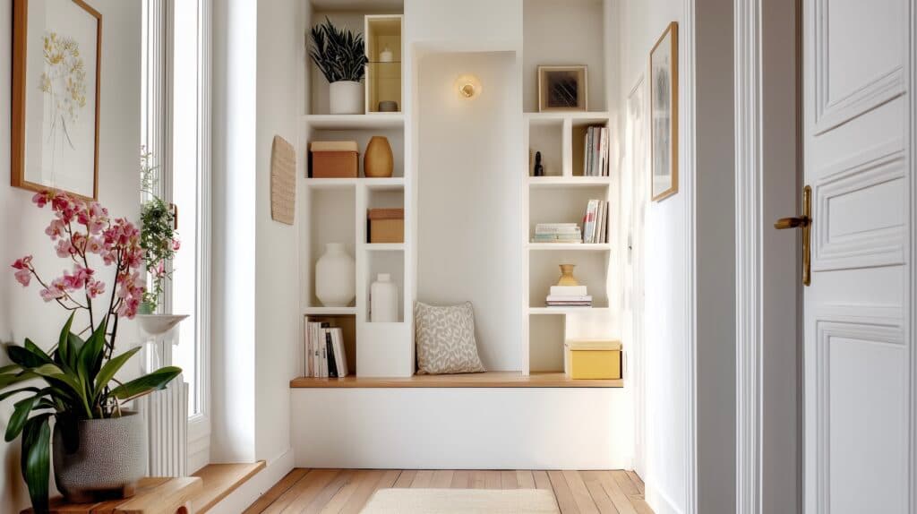 Sur un palier, on peut créer un coin lecture avec une banquette, quelques coussins et une lampe posée sur une étagère. Cet espace devient alors une bulle de calme, même dans les petits logements.