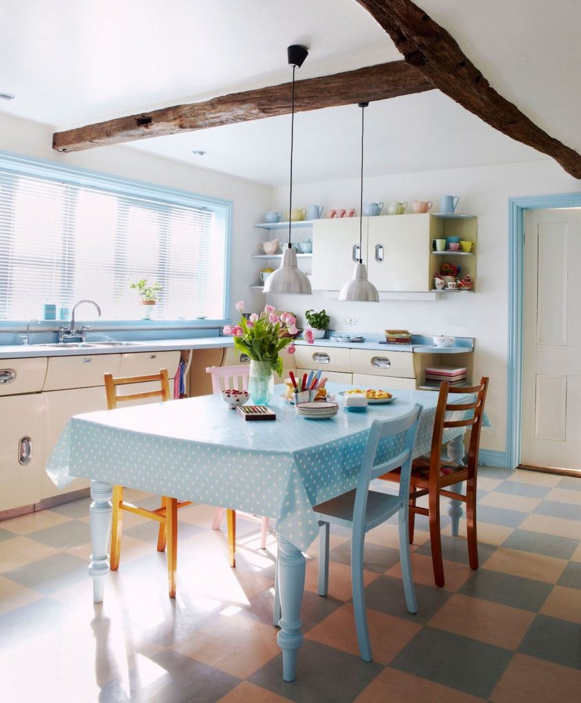 Mais finalement, pourquoi s’arrêter aux murs ? En fonction bien sûr du cas de figure, vous pouvez également peindre votre plafond. Là, vous créerez une véritable petite bulle de couleur et il n’y aura plus aucun doute sur le fait que vous avez une cuisine bleue !