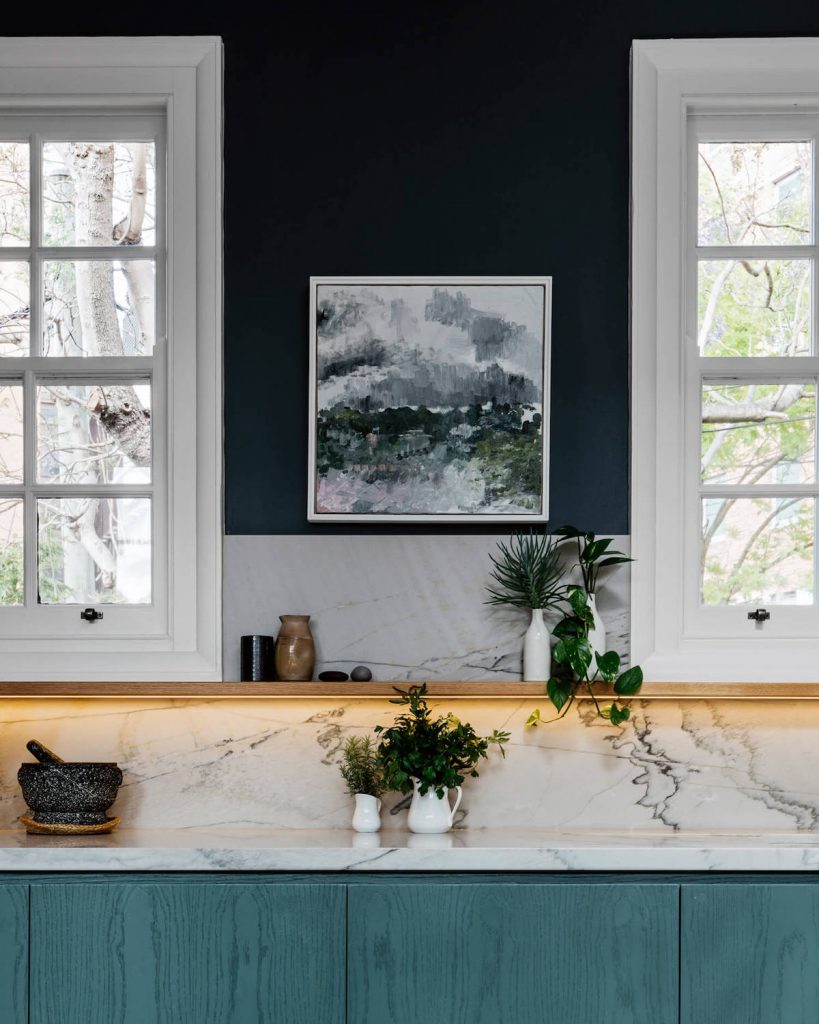 Si vous désirez créer une atmosphère accueillante et pleine de douceur dans votre cuisine pour en faire un véritable coin cosy, je vous conseille des couleurs foncées. Optez pour un bleu nuit profond, un bleu marine feutré ou encore un bleu canard sombre.