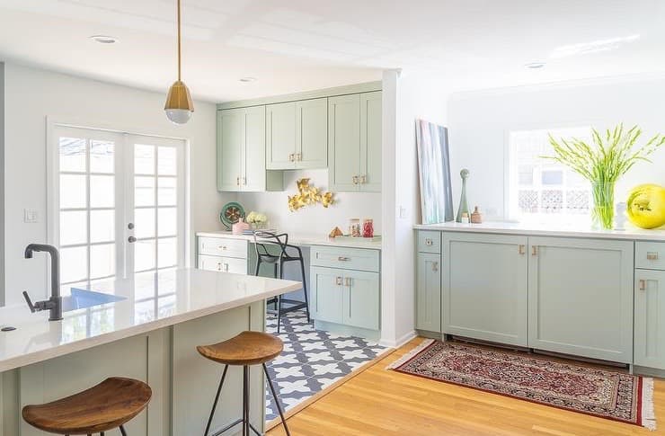La couleur verte peut être amenée dans votre cuisine par : les meubles, la peinture, la crédence ou, plus subtilement par les détails déco et l’électroménager. C’est un coloris que l’on a rapidement abandonné à tort dans cette pièce. La faute, surement à la teinte prairie, limite “fond vert” proposée par certains cuisinistes.