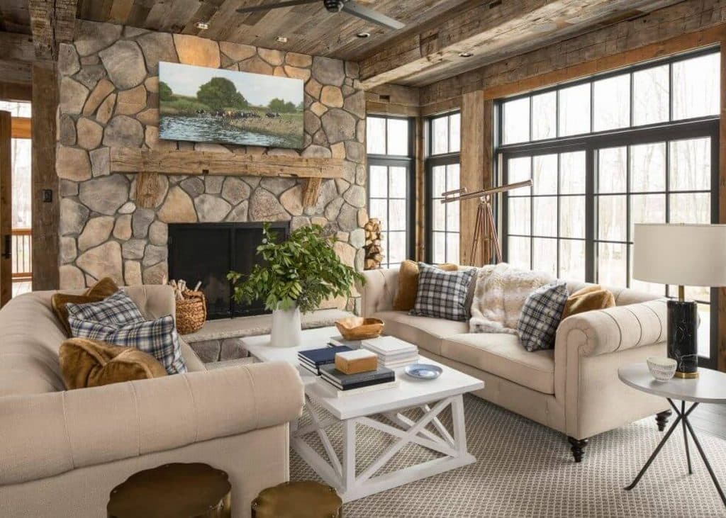Des matières naturelles pour un intérieur chic et cosy : voilà le secret de ce magnifique chalet. La pierre et le bois se marient en effet très bien. Surtout quand on désire créer un espace cosy avec une atmosphère alpine. Dans un intérieur bois, on peut facilement incorporer des éléments en pierres. Ils peuvent être des objets de décoration ou encore des pans de murs. Cette dernière option est celle qui a été choisie pour ce chalet. En effet, on peut remarquer de très beaux pans de murs avec pierres apparentes, notamment vers la cheminée du salon et celle de la chambre. De quoi donner un peu d’authenticité au lieu. Et pour le petit côté moderne, les touches de carrelage clair sont parfaites. Elles ré-haussent un peu l’espace au niveau de la luminosité et apportent une matière plus industrielle au lieu.