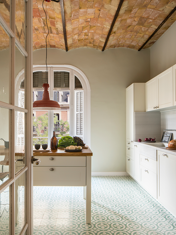 Cette pièce bureau ouvre sur la salle à manger en rotonde, encore une fois avec d’impressionnantes porte fenêtres. Le plafonnier, véritable œuvre d’art, surplombe une table ronde en bois clair. La cuisine semi-ouverte, dans les tons blancs immaculés, est volontairement simple pour magnifier le plafond en brique d’origine. Le choix d’un revêtement en carreaux de ciment motif rosace accentue ce style vintage.