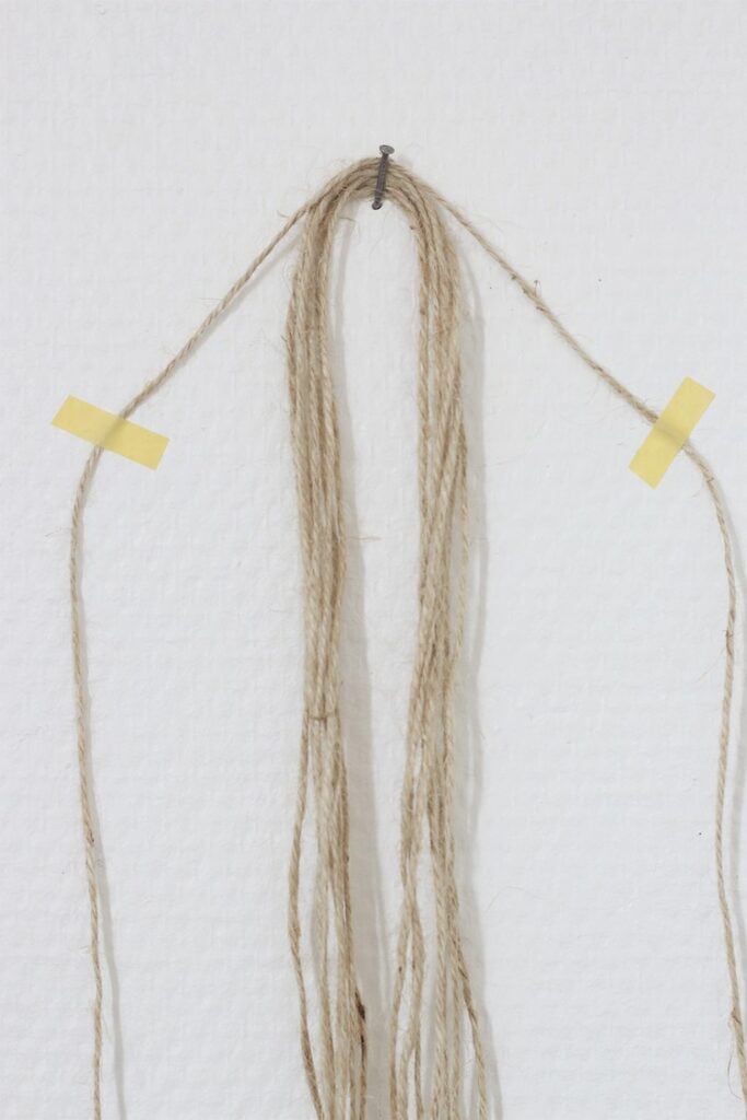 Pliez en 2 vos 8 morceaux de cordelette de jute et les accrocher sur un mur. Vous obtenez ainsi 16 brins de corde. Astuce, si vous n’avez pas de clou pour les accrocher, utiliser un morceau de masking tape pour les tenir sur votre mur). Bien détacher le brin de corde tout à droite et celui tout à gauche.