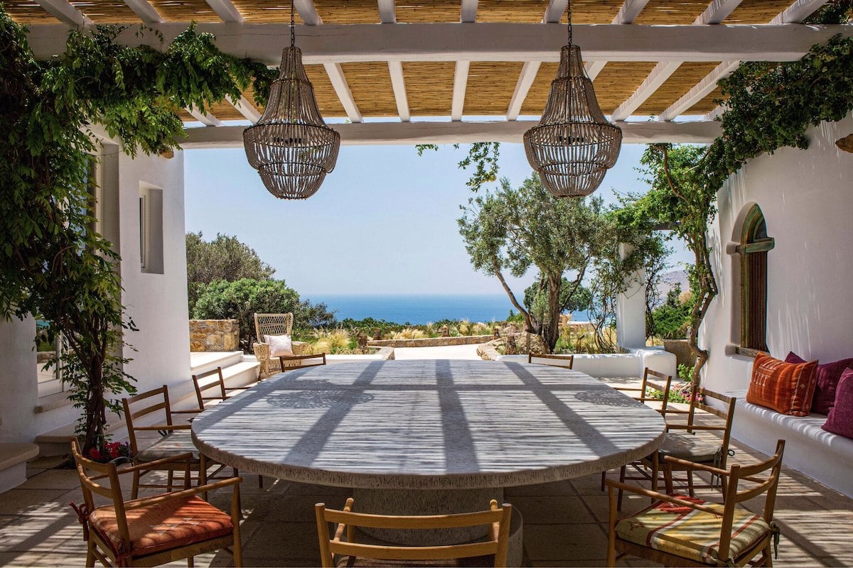 Le salon extérieur est majestueux, avec cette vue sur la mer Méditerranée. La table en marbre a été dessinée par Rebecca Körner et peut accueillir neuf personnes. Au-dessus, des suspensions en rotin s’amusent des silhouettes traditionnelles des lustres en cristal. Les bancs blancs s’habillent de jolis coussins colorés.