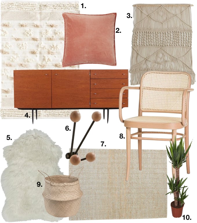 1 // 2 – Coussin LR // 3 – Tissage mural Navanita // 4 – Enfilade Pierre Guariche // 5 // 6 – Patère design // 7 – Tapis de salon // 8 – Fauteuil 811 // 9 – Panier thaïlandais// 10